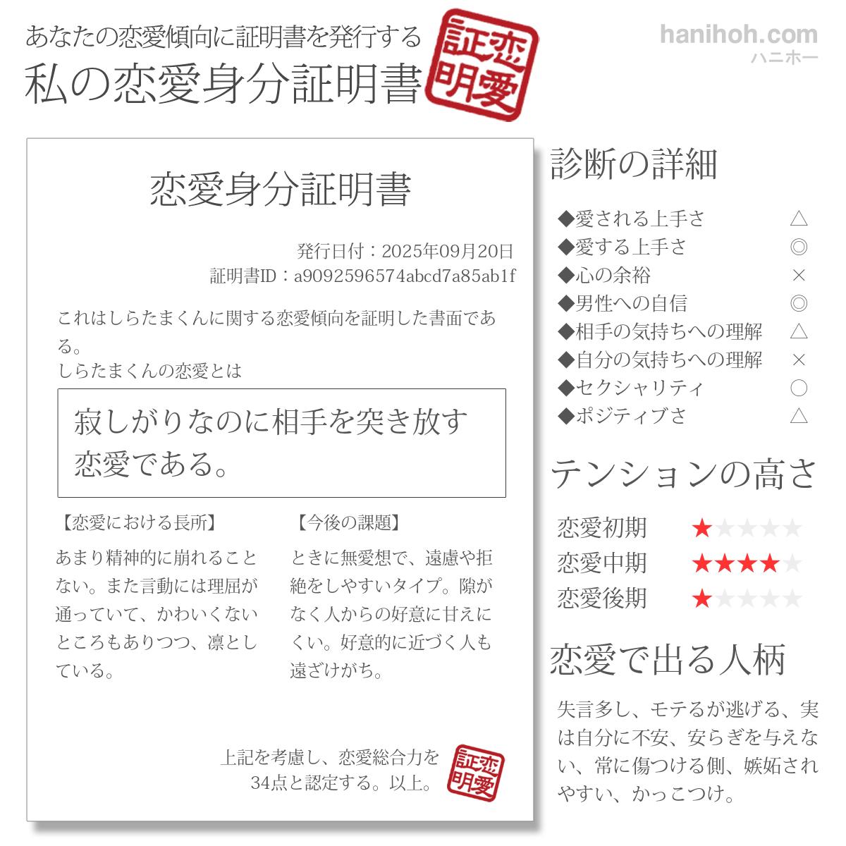 あなたの性格や恋愛観を徹底分析して、成績をつける!シンプルなコンセプトです。診断をした二人の相性を見ることも可能。